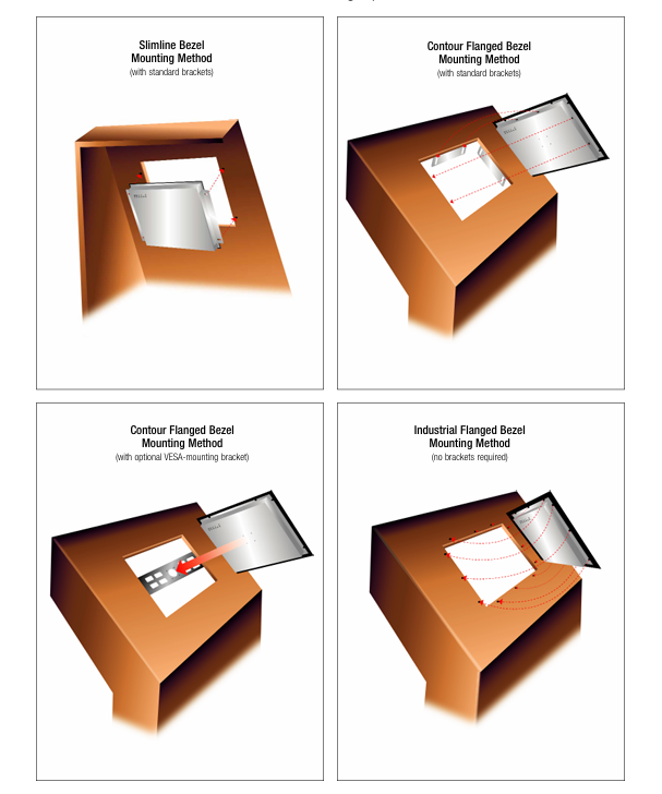 Multiple Mounting and Bezel Options Multiple mounting and bezel options enable customers to meet their application needs at minimal cost. The C1200PW display offers a 75mm VESA pattern to provide arm mounting capability for industrial automation equipment. This minimizes the capital expenditure needed to upgrade equipment with touch. L-brackets are included for installations requiring the touch display to be fully enclosed.